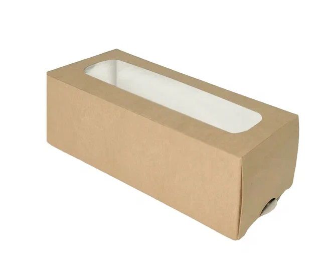 Коробка хорошо держит форму и не деформируется. Легкая самосборная конструкция экономит пространство при транспортировке и хранении. Тонкий слой ламинации защищает от влаги и жира. Натуральный цвет в ЭКО стиле для лучшей презентации продукта. Упаковка имеет большое смотровое окно, позволяющее осуществлять продажи с витрины. Коробка поставляется с внутренним ложементом.