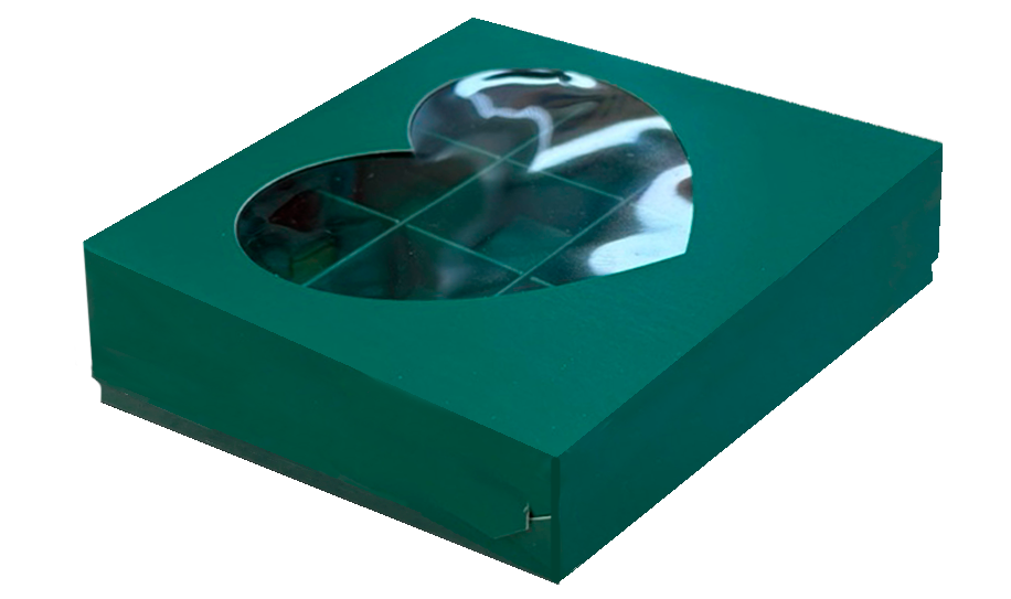 коробка бум. 155х155х30 зеленая прозрачное окно сердце