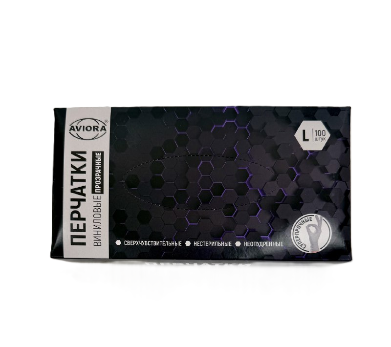 Виниловые одноразовые перчатки прозрачного цвета. Перчатки одноразовые широко используются в медицине, в сфере красоты, в быту. Виниловые перчатки предпочтительны для использования колористами и в работе по хозяйству. Винил достаточно устойчив к активным химическим веществам, к слабым растворам кислот и к щелочам. Внутренняя поверхность перчаток - неопудренная, что снижает риск возникновения дерматита. Наличие валика, скрученного вовнутрь, препятствует скатыванию перчатки. Виниловые перчатки легко как одеваются, так и снимаются. Экран большинства смартфонов чувствителен к виниловым перчаткам, не требуется снятие перчатки для ответа на звонок или включение фотокамеры. Допускается контактировать с пищевыми продуктами. Виниловые перчатки гипоаллергенны.
