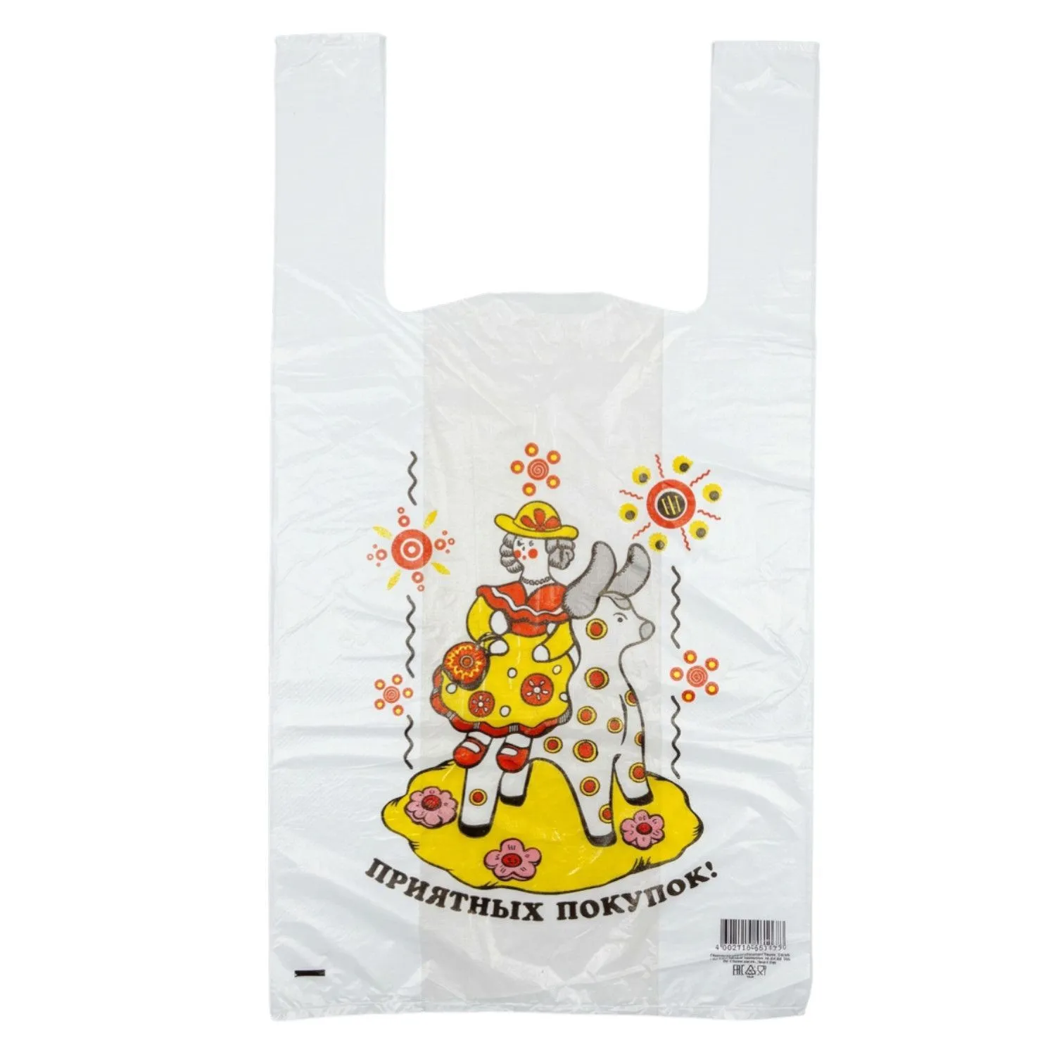 С дымковской лошадкой, яркими кругами и надписью «Приятных покупок».